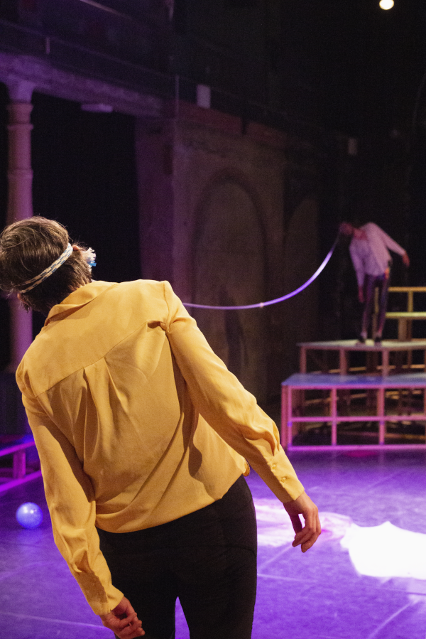 EN: Two performers work on solidary connections: they talk, jump, run, tie themselves in knots ... and celebrate a festival of shared actions. Presented in two not necessarily identical shows.