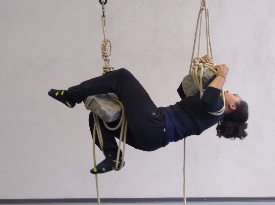 Gemeinsam mit den Luftartistinnen Jana Korb und Stéphanie N’Duhirahe lernen die Teilnehmenden Grundlagen der Zeitgenössischen Luftartistik kennen und wie eine Stückentwicklung im Narrativen Zirkus aussehen kann.