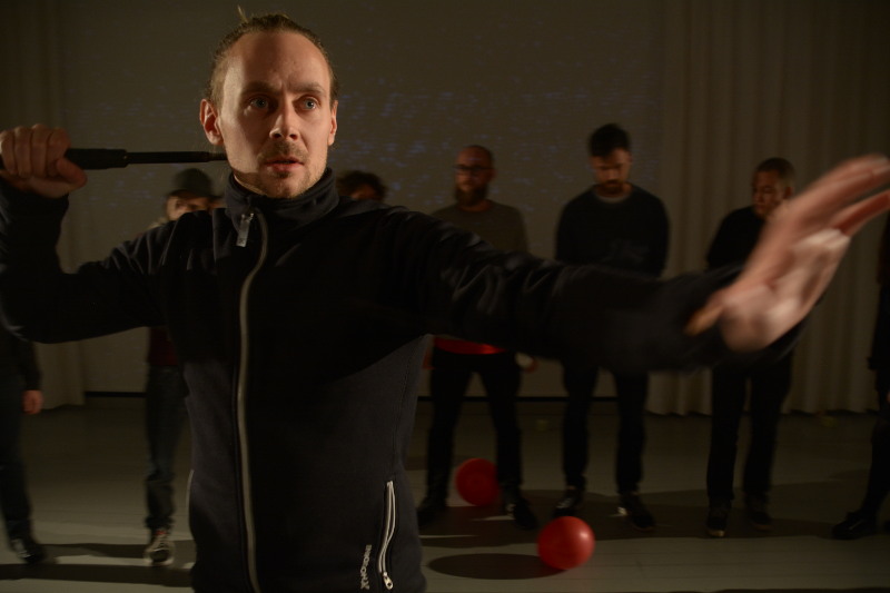 Die Produktion ist inspiriert von Bertolt Brechts Lehrstück DIE MAßNAHME, wurde allerdings ins Heute versetzt und mit Aufständen, Blockaden und Tumulten und angereichert. Vier Performer bilden zusammen mit dem Publikum eine Kette von Ereignissen, die hier und jetzt so stattfinden könnten - spielerisch aber todernst.