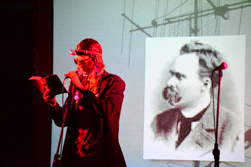 In der Performance „MACHTWORTSTUDIO: 1000 NIETZSCHE – EINE PERFORMANCE(-SKIZZE) FÜR ALLE UND KEINEN“ experimentieren Rainer Totzke (aka Kurt Mondaugen) als Philosoph, literarischer Autor und Spoken-Word-Performer und Simone Weißenfels als Experimentalmusikerin in verschiedenen Rollen mit den Möglichkeiten und Unmöglichkeiten im Hier und Jetzt etwas philosophisch Angemessenes über und zu Nietzsche und dessen „Machtwort-Philosophie“ zu sagen oder zu zeigen. Durch alle möglichen Text- und Textrezeptionsschichten hindurch, quer durch unterschiedlichste Tonlagen und Soundschichten wird erprobt, was es heißt, in der Auseinandersetzung mit Nietzsches Text auf Augenhöhe zu bleiben (oder nicht), Relevanz herzustellen (oder nicht), sich zu wiederholen (oder nicht), mit Nietzsche ironisch zu sprechen und zu agieren (oder nicht), sich selbst beim Sprechen und Darstellen existentiell aufs Spiel zu setzen (oder nicht) …