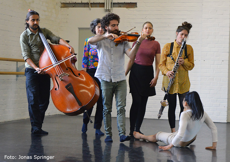 KOMPOSITION Friedemann Stolte CHOREOGRAFIE+TÄNZERISCHE LEITUNG Jana Ressel DRAMATURGIE Karin Schmidt-Feister WORT+PERFORMANCE Angelika Waniek VIOLINE Juan Salas Ruiz KONTRABASS Diego Furian KLARINETTE Friedericke v. Oppeln-Bronikowski TANZ+CHOREOGRAFISCHE MITARBEIT Saori Ando, David Espinosa ORGANISATION Wiebke Nenoff GESANG Tina Zitzmann FOTO Frank Scabata, Jonas Springer