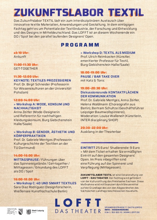 Das Interdisziplinäre Zukunftslabor TEXTIL versammelt Ingenieur*innen, Designer*innen, Wirtschaftsfachleute, Künstler*innen, Bühnen- und Kostümbildner*innen, Förderer, Forschende und Studierende zum interdisziplinären Austausch über innovative textile Materialien, Anwendungen und Gestaltung. In dem eintägigen Labor geht es um Potentiale der Textilindustrie, der Forschung und Entwicklung und des Designs in Sachsen. Vorgestellt werden außerdem innovative sächsische Textilunternehmen sowie Forschungseinrichtungen und ihre Produkte.